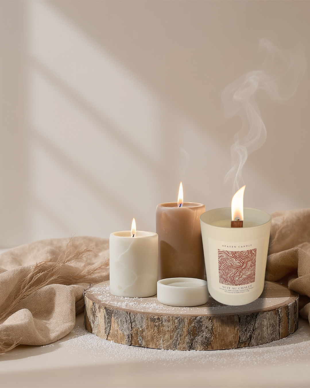 Chaque bougie de 170g, avec son temps de combustion d'environ 40H et sa mèche en bois crépitante révèle une senteur unique :