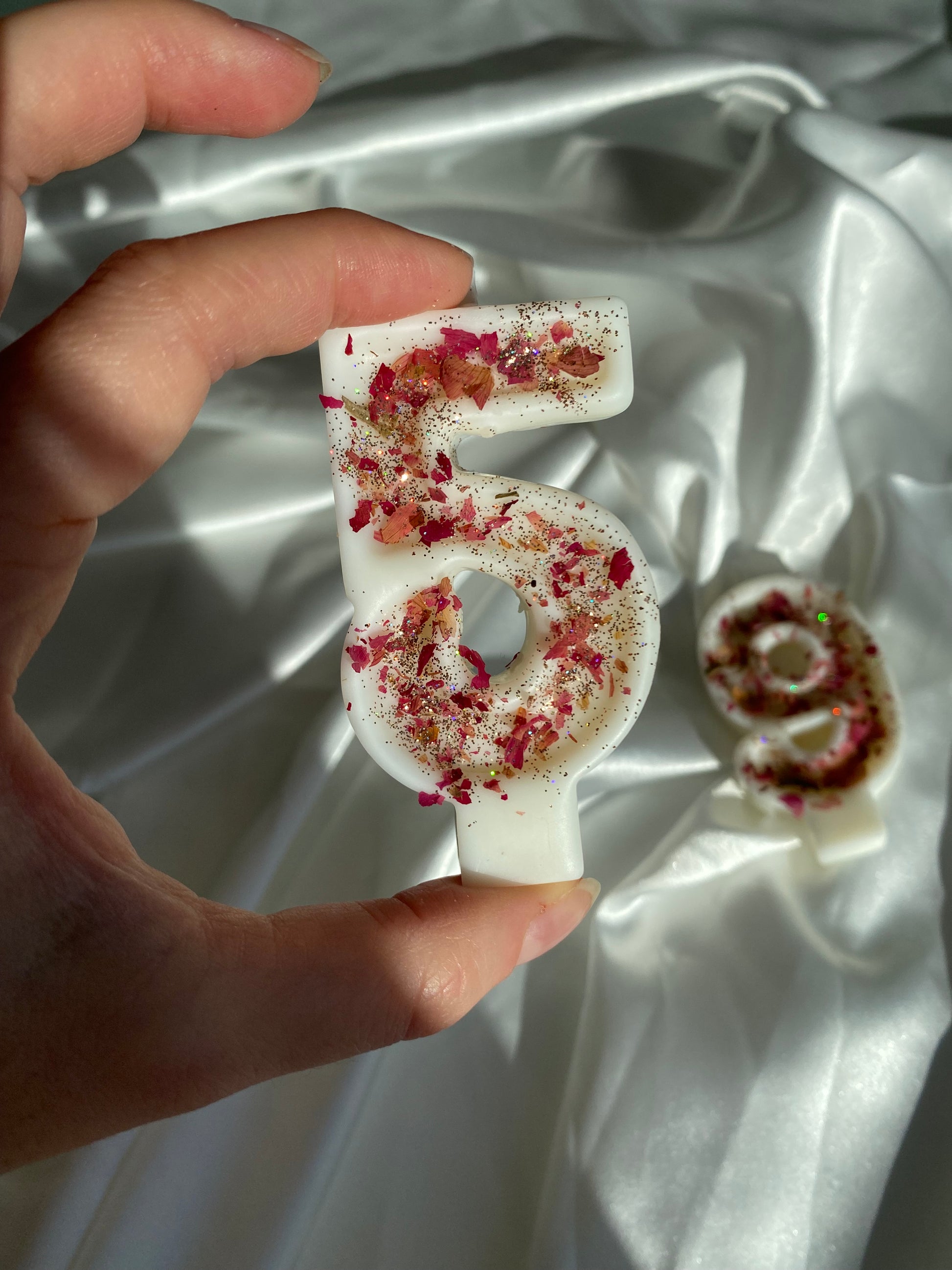 🌹 Bougie chiffre en cire de soja – Pétales de rose & paillettes